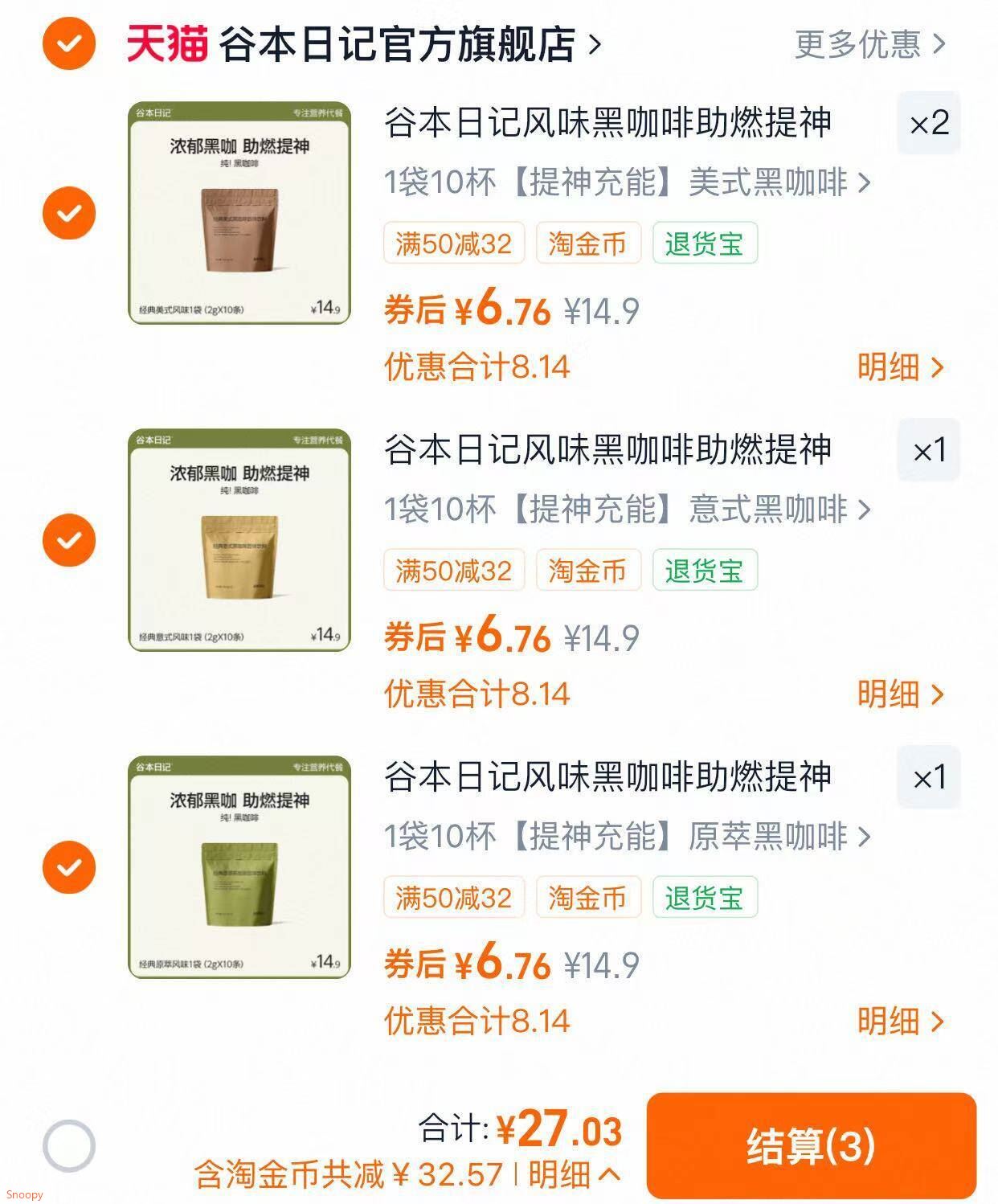 谷本日记咖啡组合拍4件27元共40包 27元发报员Z2026年04月09日 15:460举报 0.6/包 谷本日记咖啡组合 拍4件27元共40包 一杯可提神刷脂的宝来!抑制食欲超有效!https://m.tb.cn/h.iNjVvE5复制文案