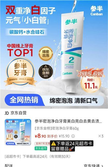 参半 牙膏shen車 自营 参半 密泡净白牙膏60g 买3件26.7元包U发报员Z2026年04月23日 21:320举报 ——参半 牙膏shen車——【自营】参半 密泡净白牙膏60ghttps://u.jd.com/fGC5pMh买3件26.7元包U,限时包U*反24元超.市卡 才折0.9元/支复制文案