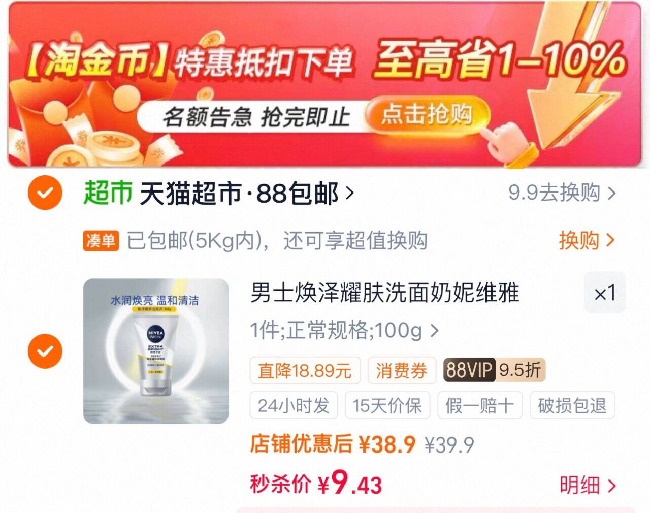 妮维雅男士洗面奶100ml 9.4元