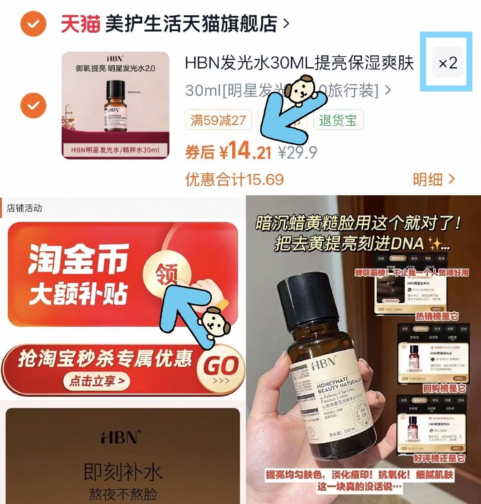 HBN精粹水发光水30ml*2瓶 拍②件 28.4元发报员Z2026年04月25日 19:270举报 拍②件到手共60ml才28.4元---HBN精粹水发光水30ml*2瓶https://m.tb.cn/h.iGbH96B 下拉详情叠加4.39淘金币暗沉肌的天菜 提亮猛吸黄气复制文案