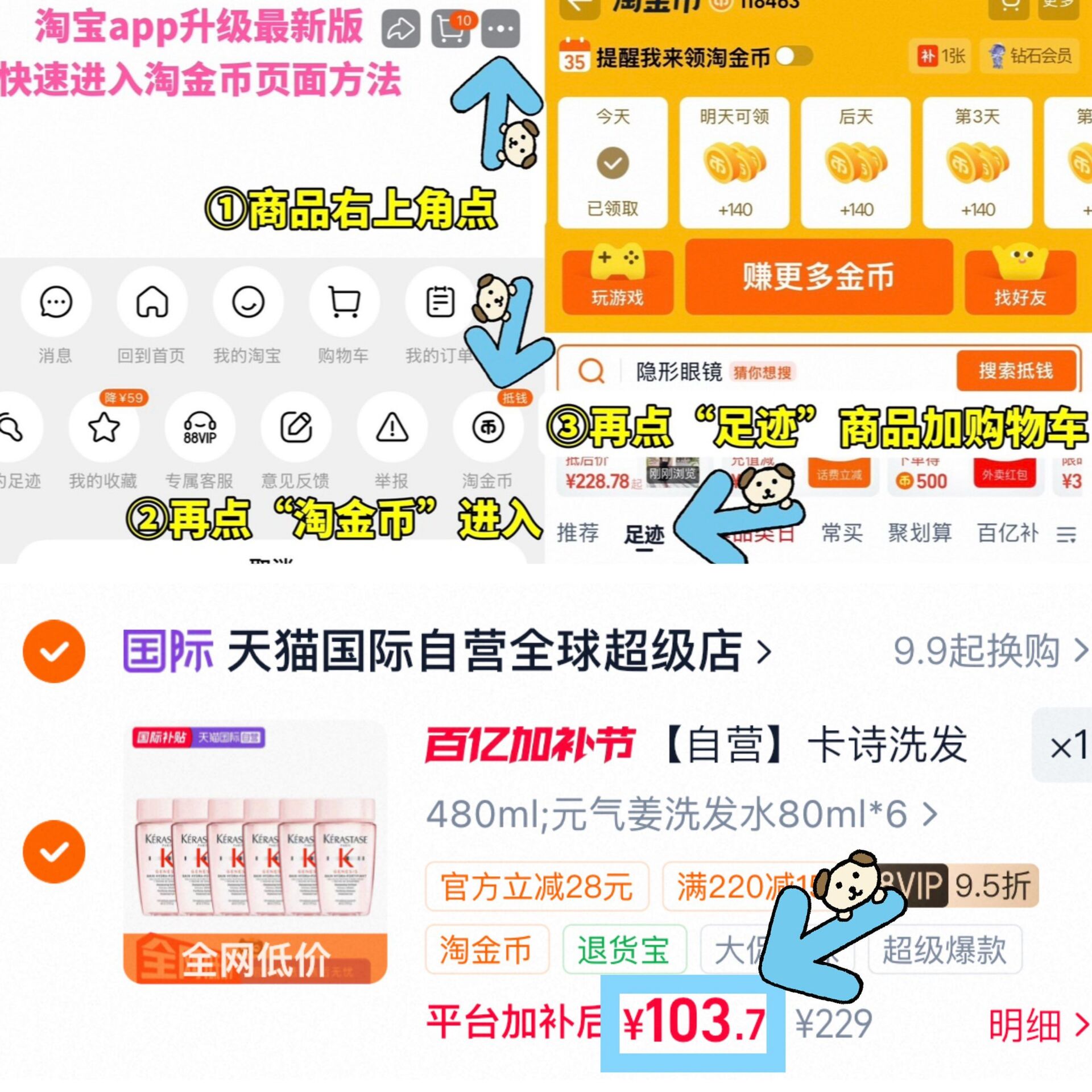 ①如图点右上角3个点选淘金币