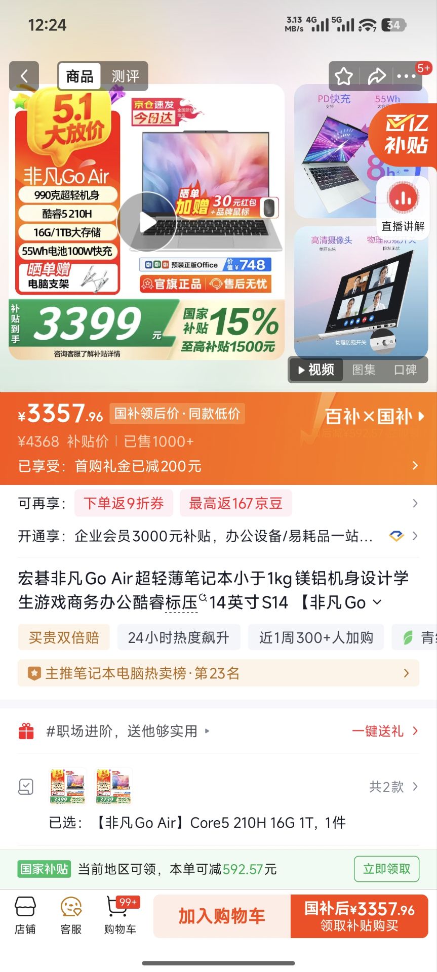 宏碁非凡Go Air超轻薄笔记本小于1kg镁铝机身Core5 210H 16G 1T 3357.9元发报员Z2026年04月26日 00:280举报 宏碁非凡Go Air超轻薄笔记本小于1kg镁铝机身Core5 210H 16G 1T,部分地区国补3357.9https://u.jd.com/fgQTgDQ复制文案