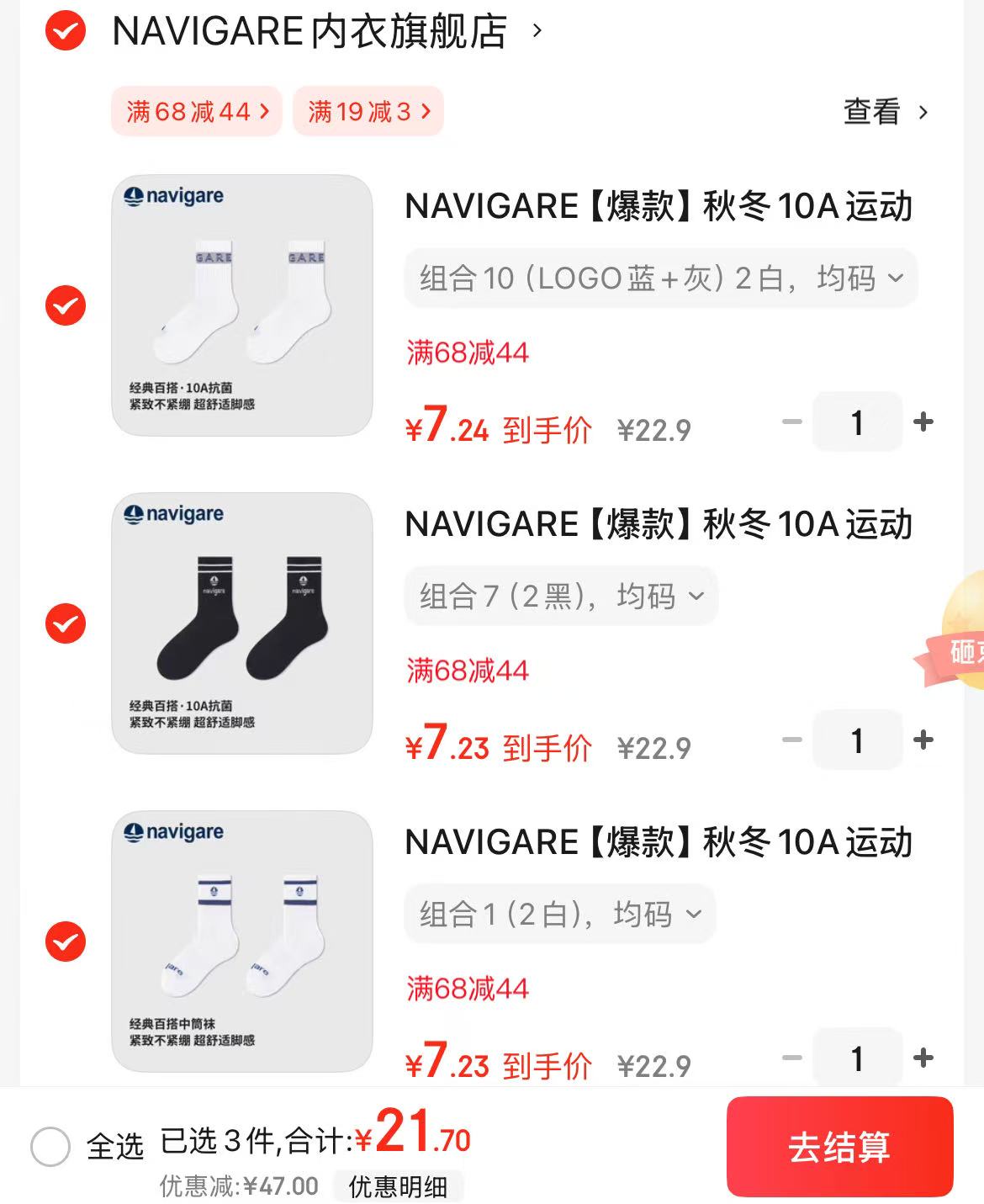 任选3件21.7元;折3.6/双