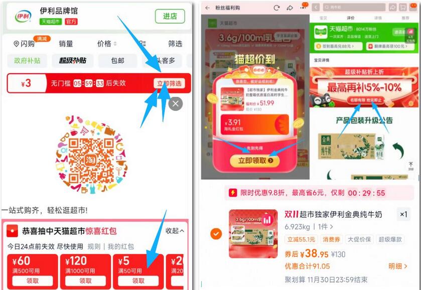 淘宝猫超搜 伊利 把3元的品牌金给拿了 - 淘宝扫 拿取50-5元包 或者天猫超市首页也可领