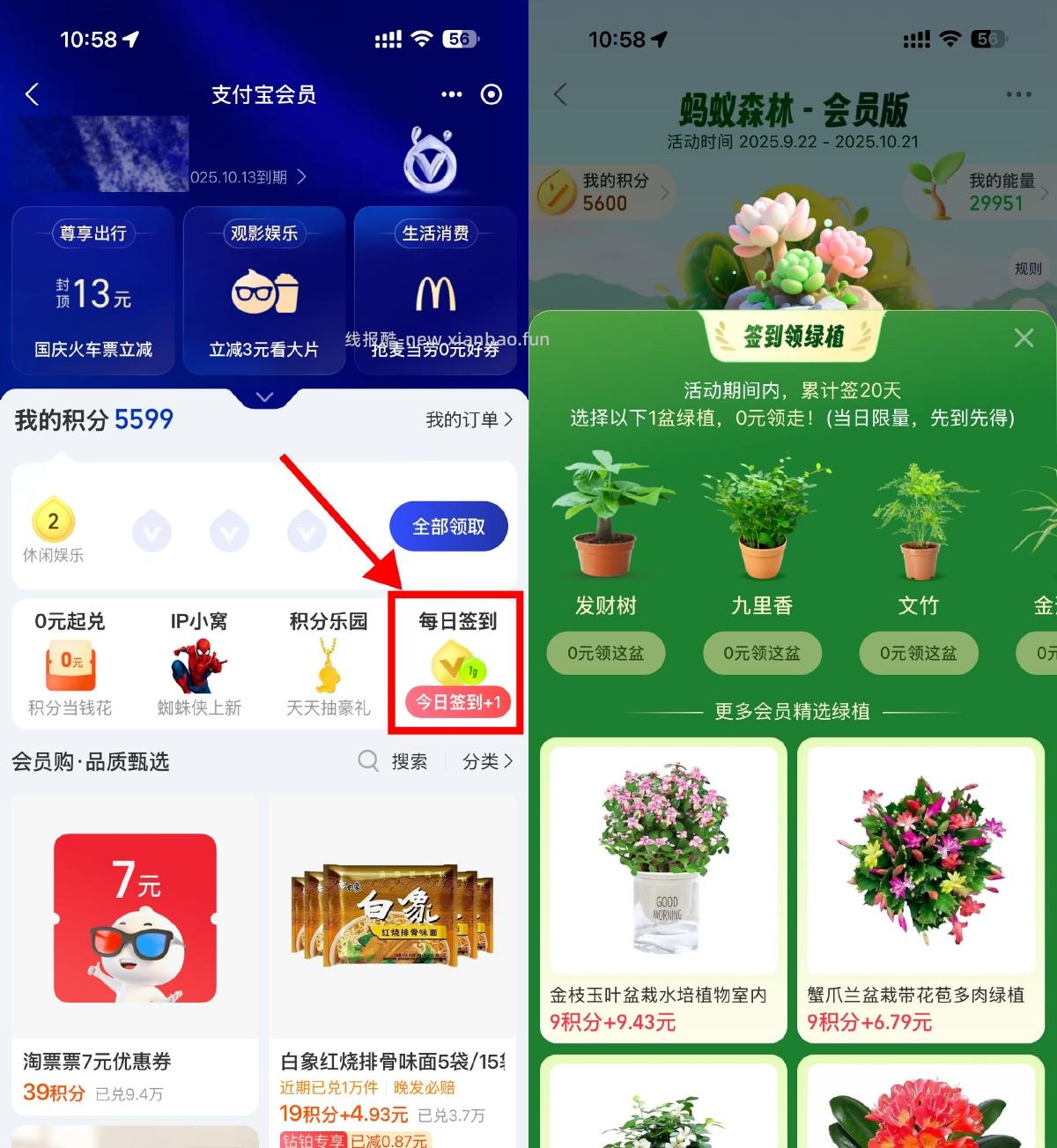 支付宝蚂蚁森林签20天领绿植小刀2025年09月25日 13:480举报支付宝搜索“支付宝会员”->右侧“每日签到”->累计签到20天0亓领绿植包邮复制文案原文地址:https://www.x6d.com/i-wz-29969.html版权声明:本站作为免费线报整合平台,文章快照抓取源于网络。临时存储未经验证,本站不参与任何平台活动,请自行甄别,谨防受骗!