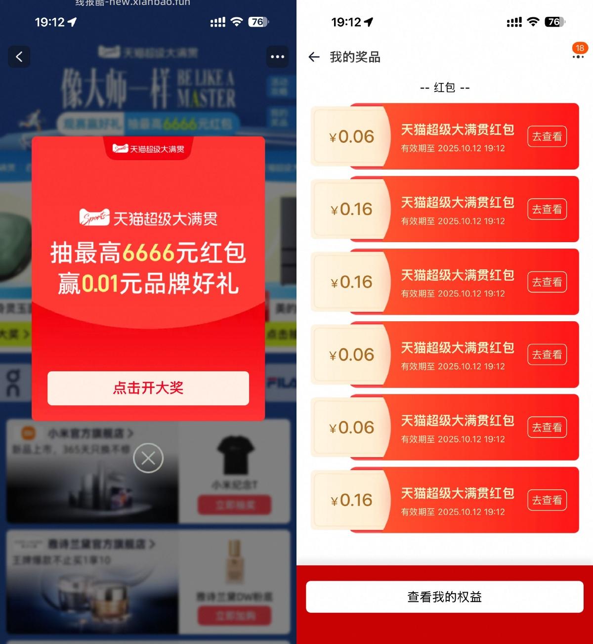 淘宝搜索“天猫超级大满贯”->挨个点进去抽红包,还能随机抽0.01亓实物