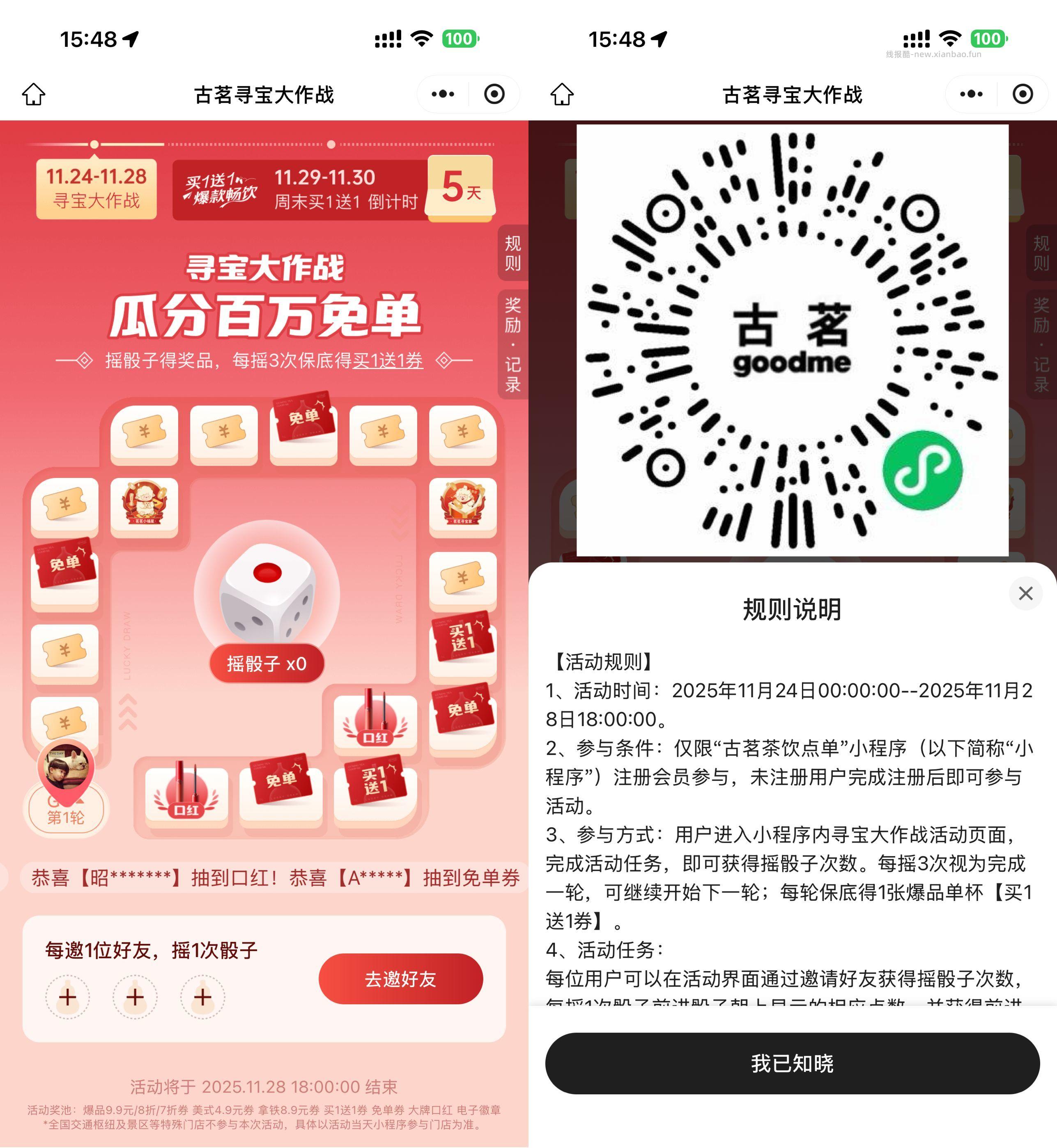 微信打开活动->每邀请3人得1次机会,抽100万份免单券,累计抽3次必得买一送一券