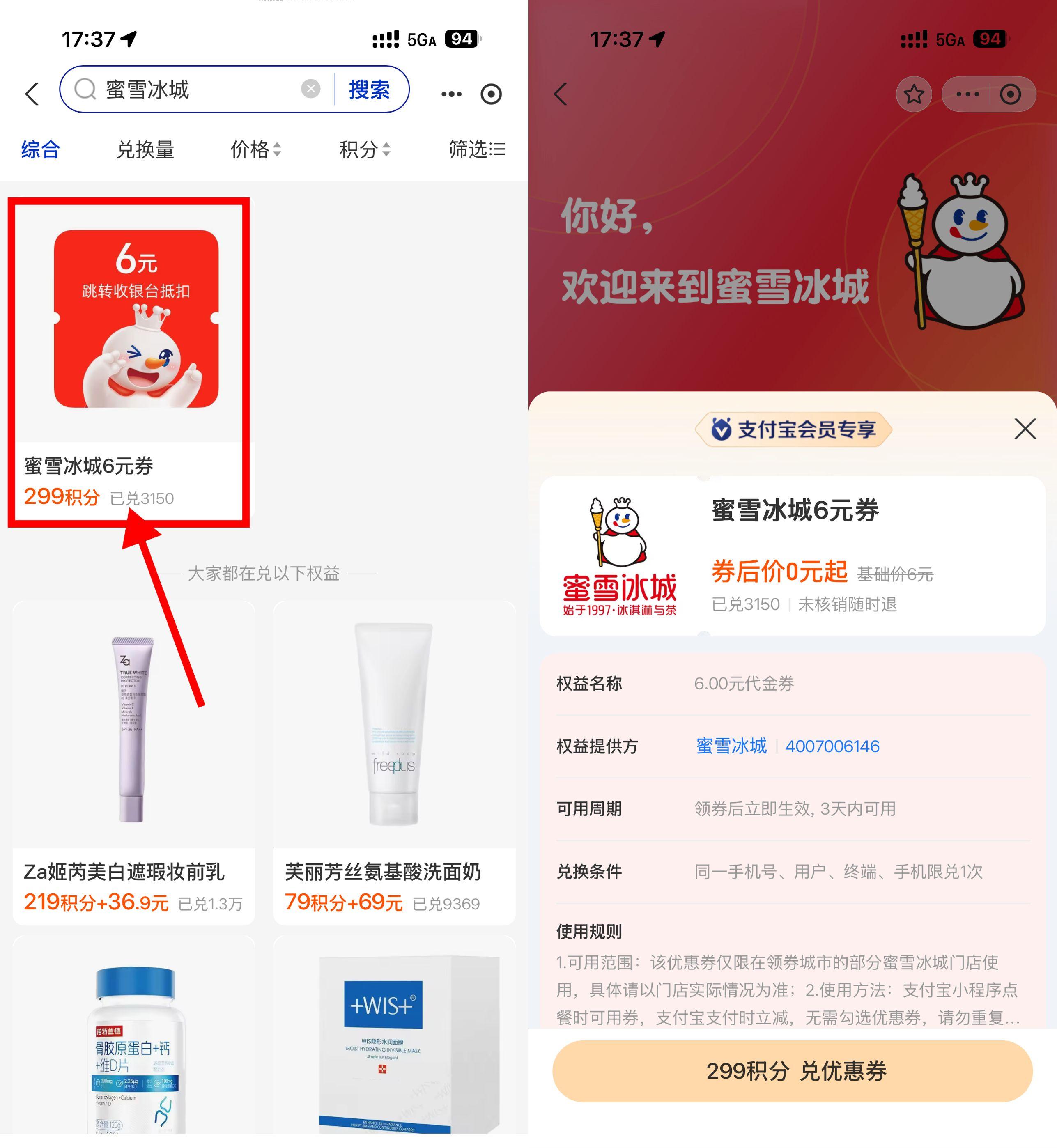 支付宝搜索“支付宝会员”->进入搜索“蜜雪冰城”->使用299积分兑换6亓无门槛券,支付的时候才能看见抵扣