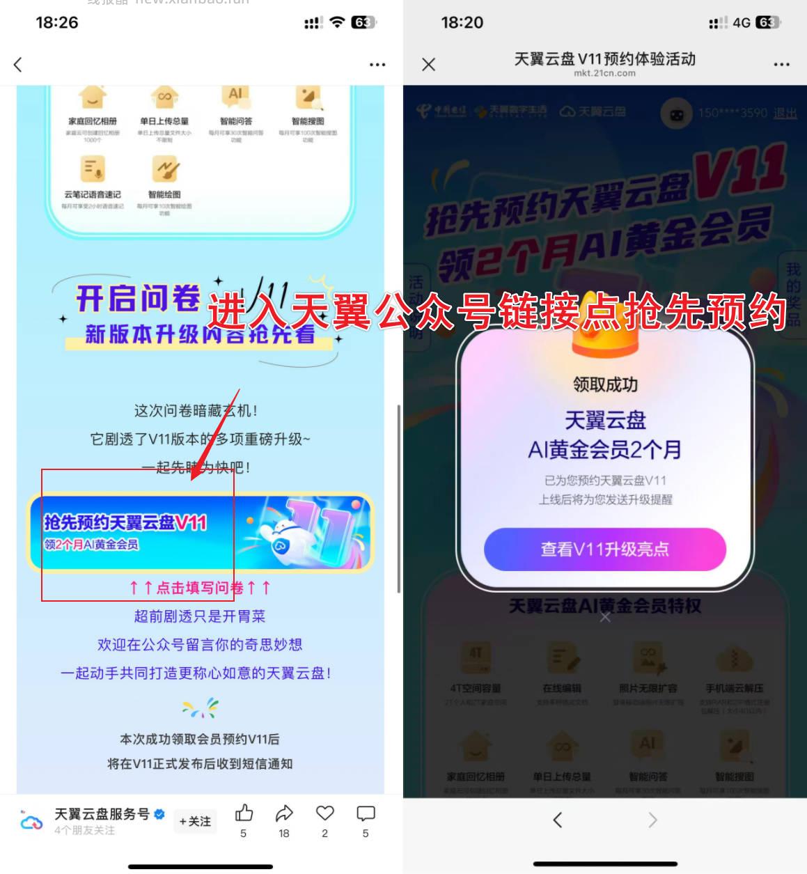 点击下面天翼公众号链接进入-登录-点击抢先预约天翼云盘v11进入-点击领取