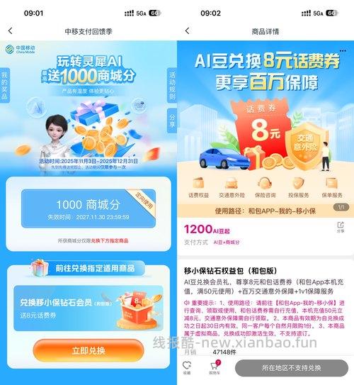 跳转到和包APP->直接领1000定向积分,可兑换钻石会员 包含50-8亓话费券