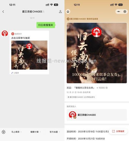 微信关注#公众号:霸王茶姬CHAGEE ->回复“归云南慢慢来”->12月21日10点整开,抽1万张免单券