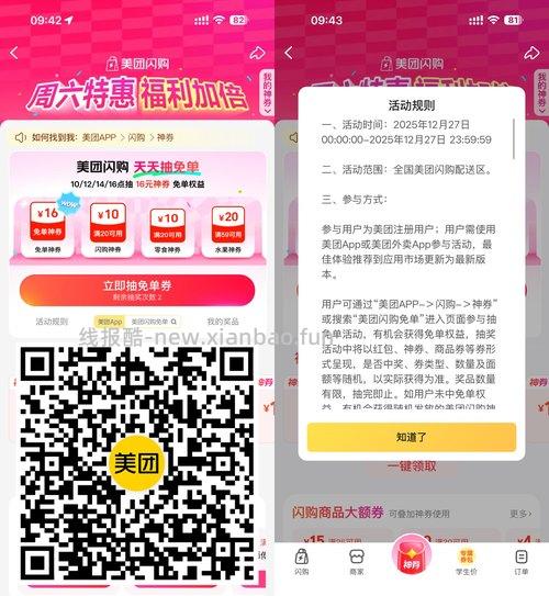 【美团抽30万份30亓闪购免单】美团APP扫码->今天11/12/14/16点会放水,抽啤酒/水果/闪购免单神券