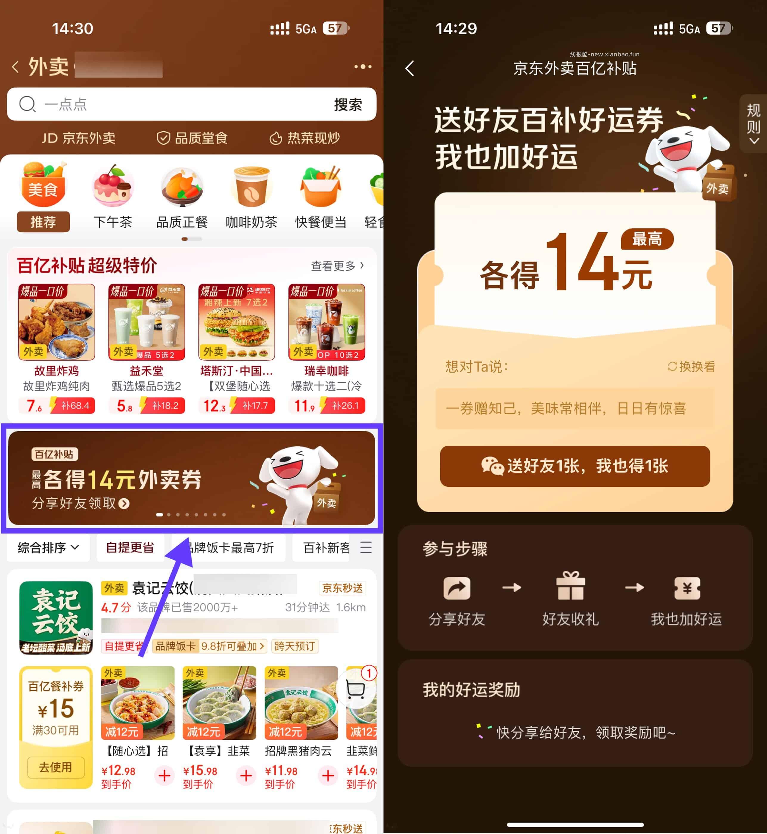 京东搜索“秒送补贴888”->点横幅进入->分享好友 均可得11亓外卖券 和 4-3亓叠加券,就是点外卖立减14亓